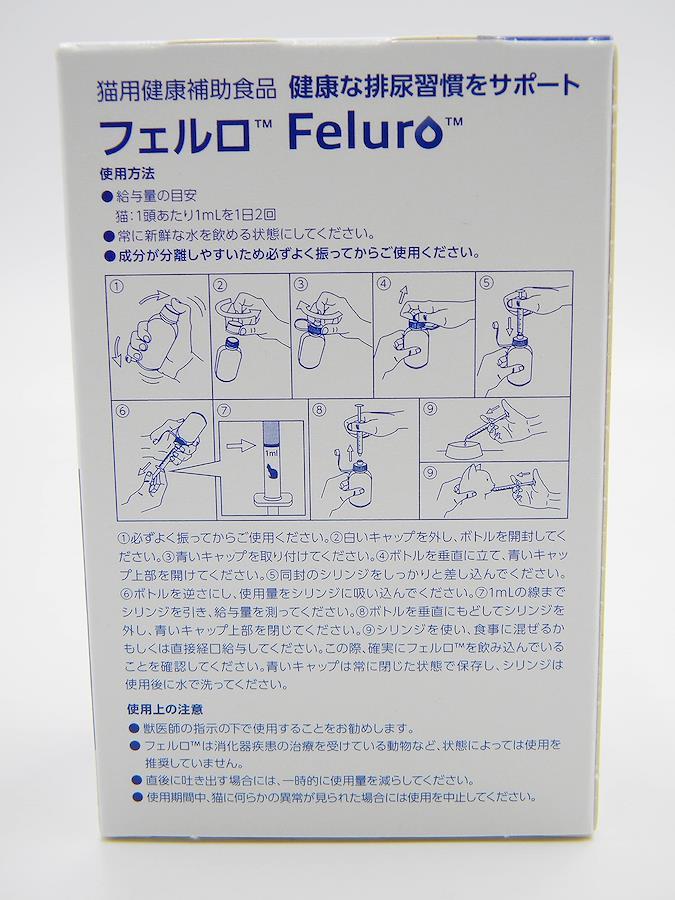 ①よく振ってからご使用ください。 ②初めて開封する際は、白いキャップを外し、ボトルを開封してください。 ③青いキャップを取り付けてください。2回目以降は青いキャップのままで保存いただけます。 ④ボトルを垂直に立て、青いキャップ上部を開けてください。 ⑤同封のシリンジをしっかりと差し込んでください。 ⑥ボトルを逆さにし、使用量をシリンジに吸い込んでください。 ⑦ボトルを垂直にもどしてシリンジを外し、青いキャップ上部を閉じてください。 ⑧シリンジを使い、食事に混ぜるかもしくは直接経口給与してください。保存時は青いキャップを常に閉じた状態で保存し、シリンジは使用後に水またはぬるま湯で洗ってください。