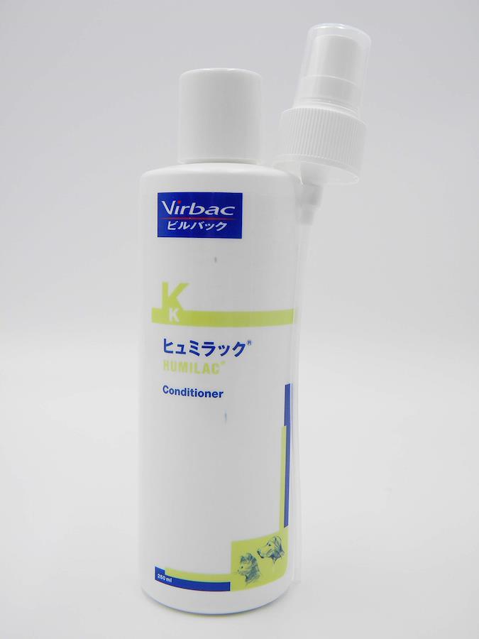 ヒュミラックは2つの使い方でお使いいただけるコンディショナーです。 【スプレーとして使用する場合】 毛をかき分け肌がしっとりするまでスプレーします。 体中まんべんなくスプレーしてあげてください。 1日何回でも使用できます。 Point 1:身体に近づけてスプレーすると愛犬を驚かせずにすみます。 Point 2:顔の近くでは手で覆ってスプレーが飛び散らないようにしてあげましょう。 Point 3:毛がしっとりしてまとまることがあります。愛犬が気にするのであればくしやブラシで優しく毛をとかしてあげてください。 【シャンプー後にかけ流して使用する場合】 ぬるま湯1Lに対して、ヒュミラックのキャップ3杯を入れかき混ぜます。 シャンプーをしっかり流した後、できるだけ水気を切ってからぬるま湯に混ぜたヒュミラックをかけます。 Point 1:お尻の方からゆっくりかけると愛犬を驚かせずにすみます。 Point 2:顔は優しく、手でかけてあげましょう。