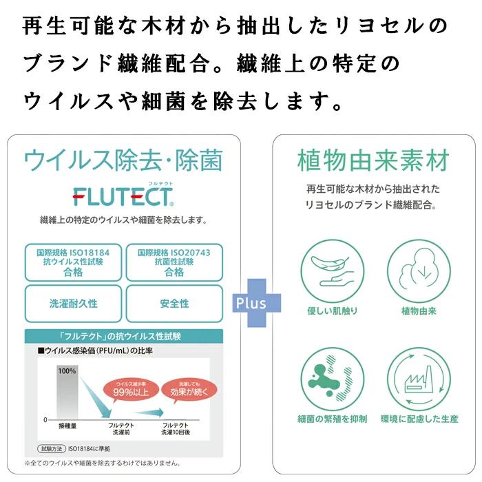 再生可能な木材から抽出したリヨセルのブランド繊維配合。繊維上のウイルスや細菌を除去します。※フルテクトはシキボウが開発した特定のウイルスの数を減少させる加工です。※全てのウイルスや細菌を除去するわけではありません。