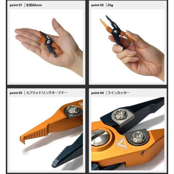 超軽量、小さな本格プライヤー 超コンパクトな多機能プライヤー。わずか8.2cm、25gの小型ボディ。可愛らしくも本格的な多機能。 軽量高強度なジュラルミン素材を採用。先端はスプリットリングが簡単に外せるスプリットリングオープナー。PEラインにも対応するタングステンラインカッター。安全なロック機能。 プライヤーホルダー、カラビナが付属。小さくても本格的なプライヤー。全長(cm):8.2自重(g):25スプリット対応サイズ:#0材質:ジュラルミンカッター材質:タングステンバネネジ材質:ステンレス 。