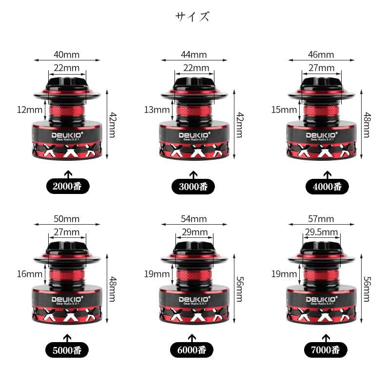 ギア比 : 4.7:1サイズ: FS2000 / FS3000 最大ドラグ力:8Kgサイズ:FS4000 / FS5000 最大ドラグ力: 10Kgサイズ: FS6000 / FS7000 最大ドラグ力: 12Kg糸巻量: FS2000番:MM/M 0.18/200 0.20/160 0.25/120 FS3000番:MM/M 0.20/180 0.25/150 0.30/120 FS4000番:MM/M 0.25/220 0.30/150 0.35/100 FS5000番:MM/M 0.28/200 0.33/150 0.35/120 FS6000:MM/M 0.30/270 0.35/240 0.40/160 FS7000:MM/M 0.35/250 0.45/220 0.50/160左右交換可能:ハンドルノブは濡れた手で触っても滑りにくい金属製材料を採用。ハンドルもCNC金属製で、左右に交換できます。この組み合わせは、スピン性能と巻線効率を検討する際の最も強力な選択肢です。ハンドルには折りたたみの設計で、収納は便利です。耐腐食:高強度の素材採用し、腐食保護を強化し、淡水だけでなく、海釣りでも安心してお使い頂けます。 ご注意:もし海に行って釣りをしなければならないなら、釣りをして帰ってきて清水できれいに洗って、メンテナンスをしてください。軽量、携帯便利:超軽量、持ち運びが簡単、トランク、ボート、バックパックなどに入れやすい、ライントラブルが少ない、軽いルアーでも遠投がしやすい、扱いが容易。