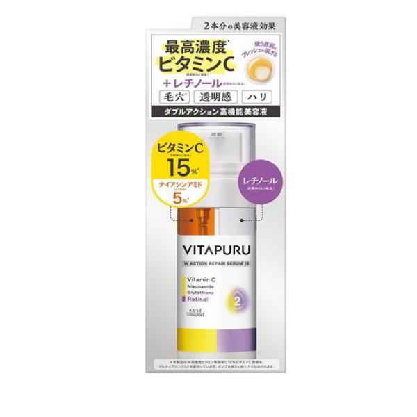 製品の特徴●コーセーコスメポート ビタプル ダブルアクション リペアセラム 15(KOSE VITAPURU W ACTION REPAIR SERUM)●2つの美容液効果が1本に!透明感(*1)を高め、ハリのある肌へみちびく攻めのケア。●毛穴・くすみ(*2)に集中アプローチ:ビタミンC誘導体15%、ナイアシンアミド5%、グルタチオン配合(すべて保湿)。●肌をやわらげ浸透(*3)促進:レチノール誘導体、乳酸菌発酵エキス、セラミド、ペプチド配合(すべて保湿)。●2種の美容液が同時に出る2剤式容器採用:高濃度ビタミンC誘導体(保湿)とレチノール誘導体(保湿)が直前にフレッシュに混ざり合い効果を発揮!●販売名:VP ダブルアクション リペアセラム 15
