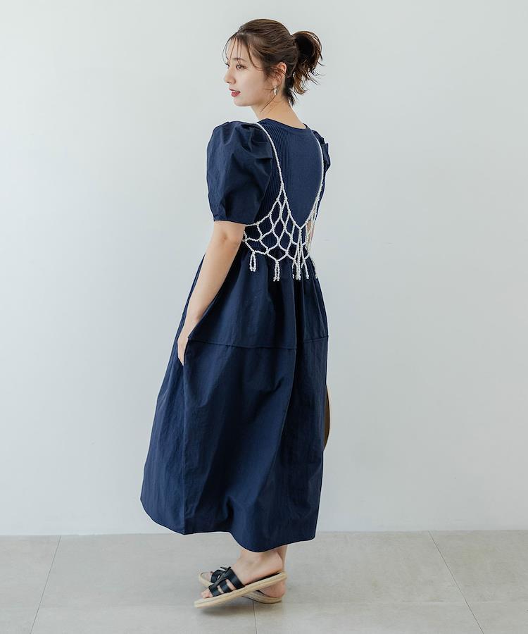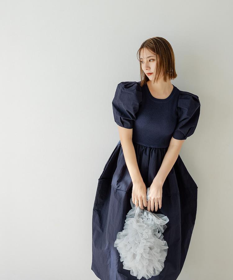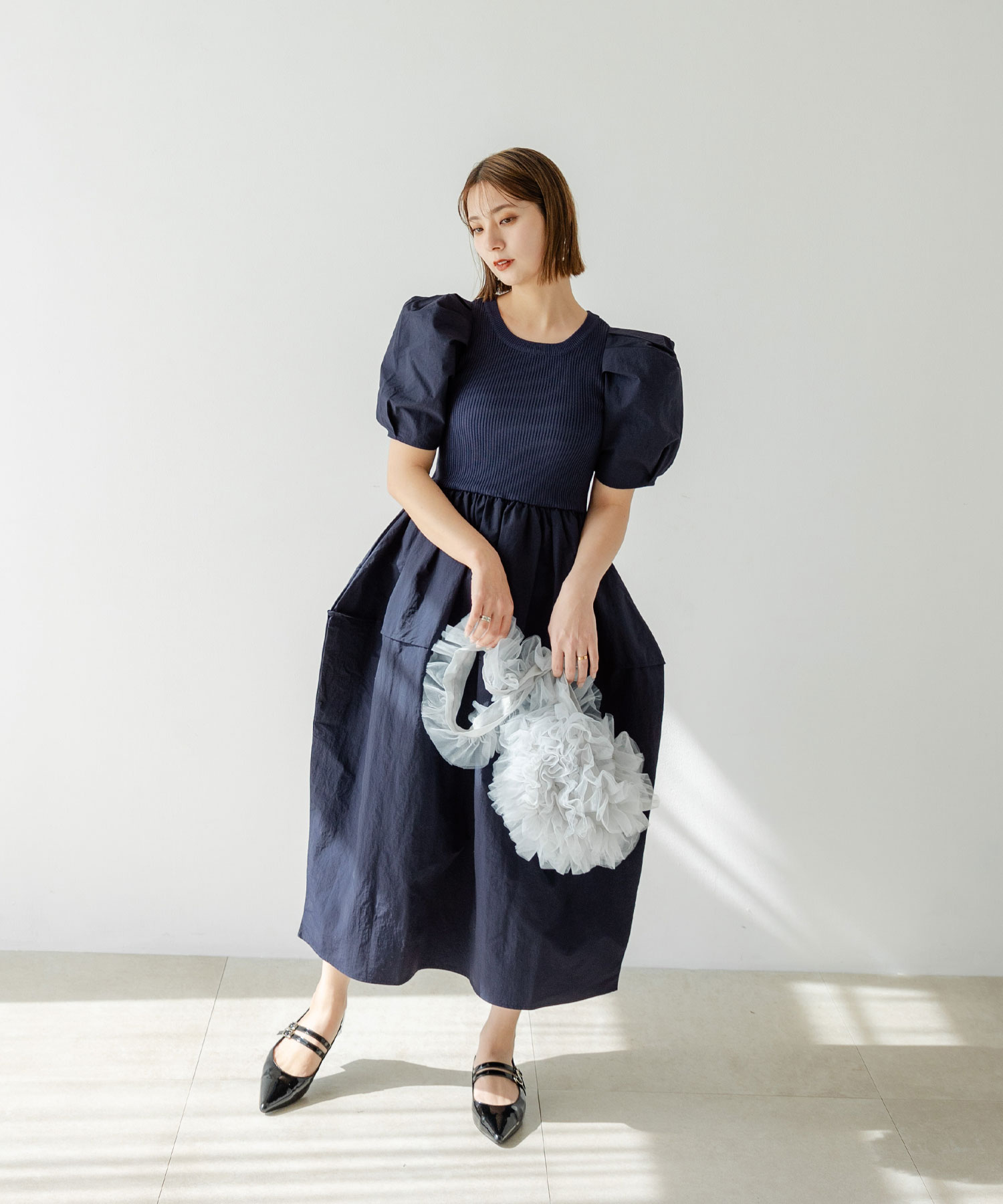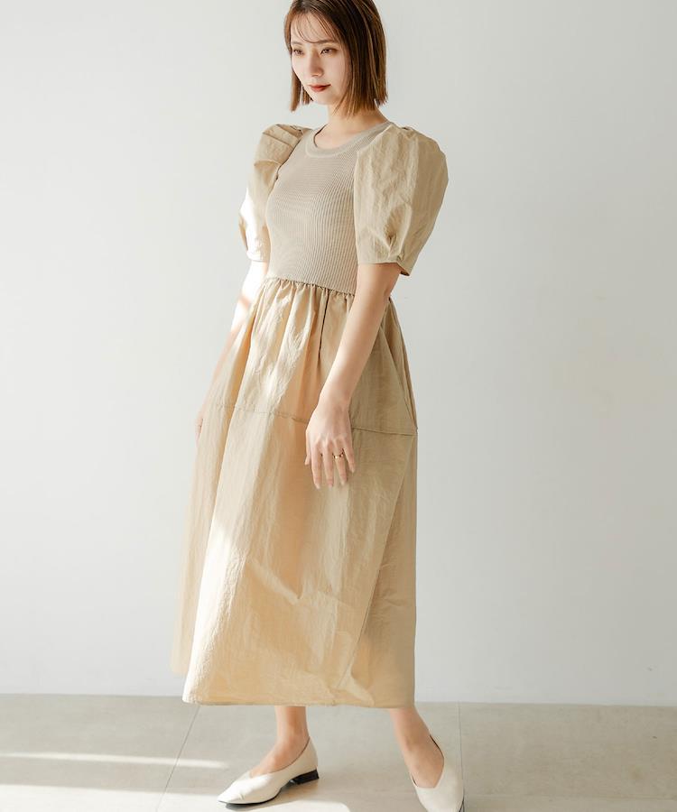 さらりとした着心地の良いリブ編みニットに異素材をドッキングさせたワンピース。
