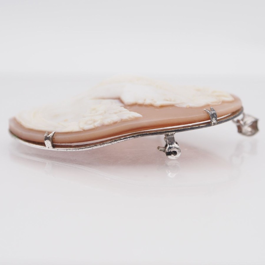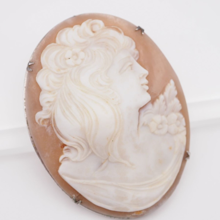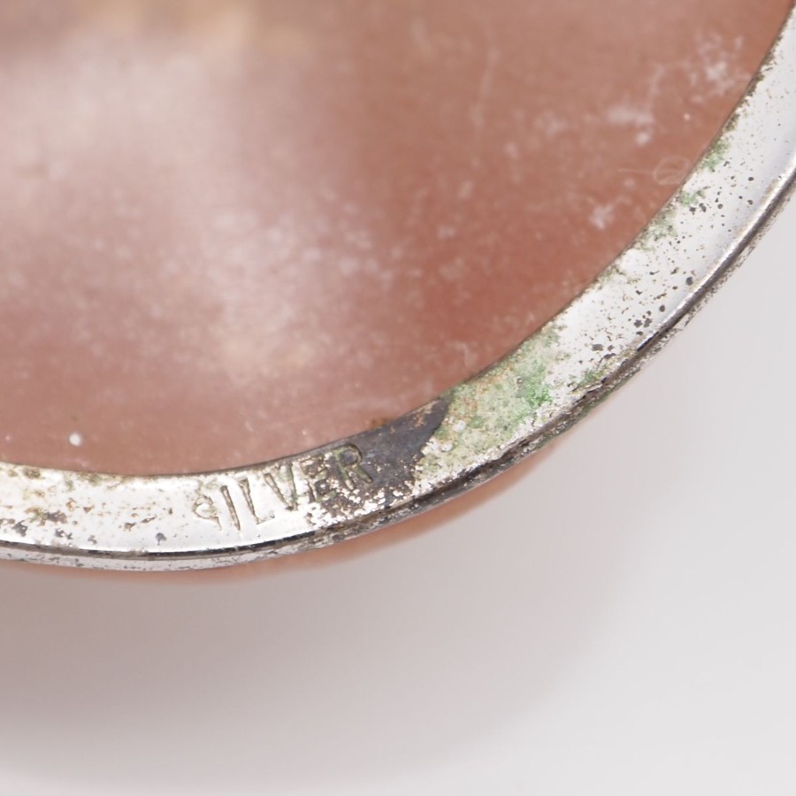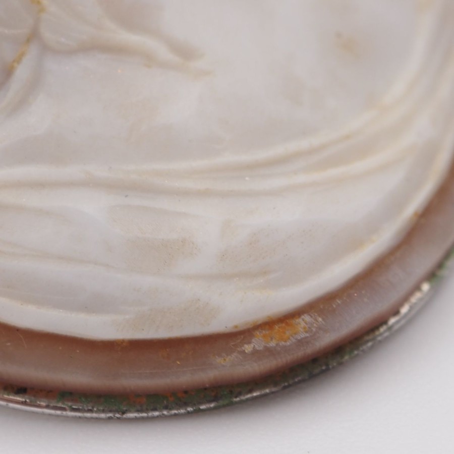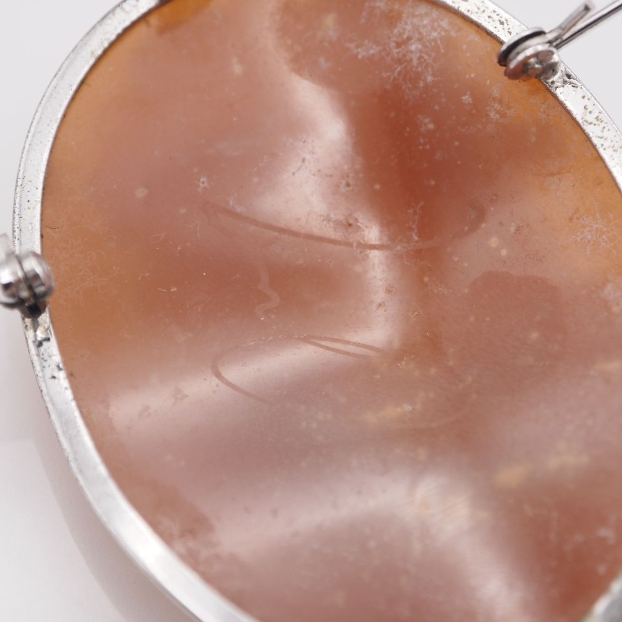 W061 Shell Cameo Brooch, Artist Signed, Silver Engraved, Female Profile Design, Silver Vintage