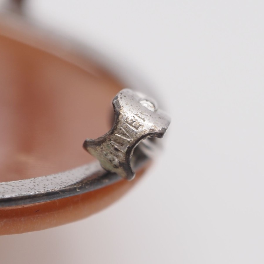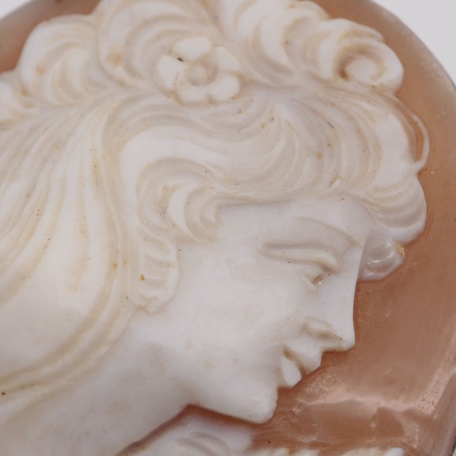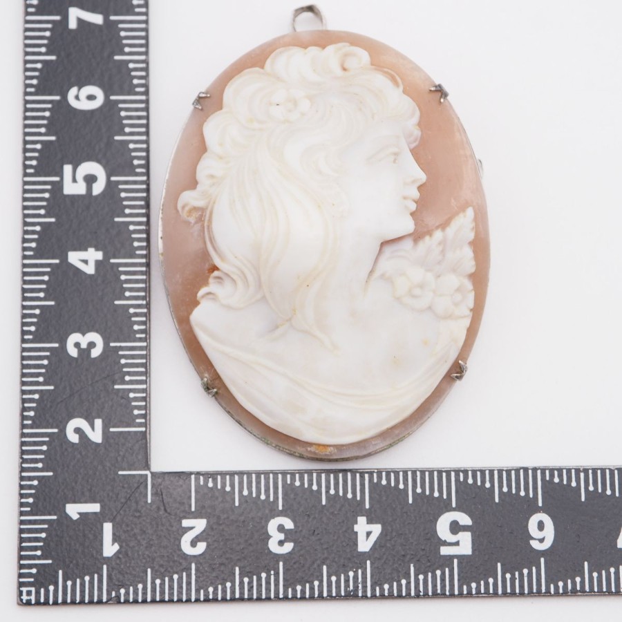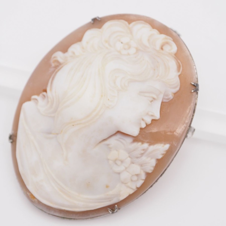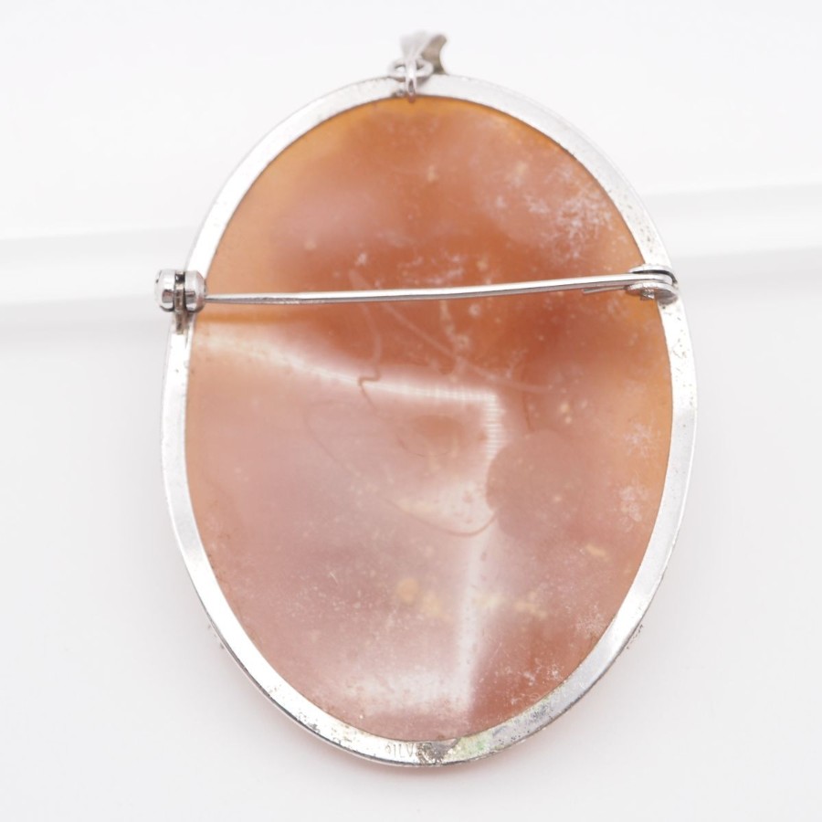 W061 Shell Cameo Brooch, Artist Signed, Silver Engraved, Female Profile Design, Silver Vintage