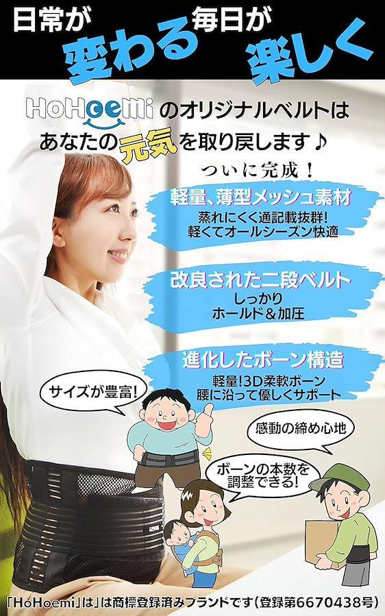 ・「HoHoemi 「ほほえみ」腰ベルトの特徴(1)」腰のラインに沿った弓形の軽量特殊ABS樹脂3Dボーンを5本採用。 長時間立っている時も座っている時もしっかりサポートし、くびれ感も演出します。 ボーンは出し入れができるので自由に本数を変更でき、ご自身の体調やご使用環境に応じて硬さの調整が可能です。