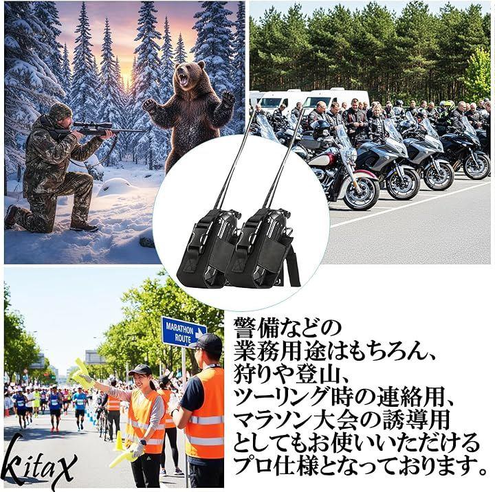 警備などの業務用途はもちろん、狩りや登山、バイクツーリング時のグループ連絡用として、マラソン大会などの誘導スタッフ用としてもお使いいただけるプロ仕様となっております。
