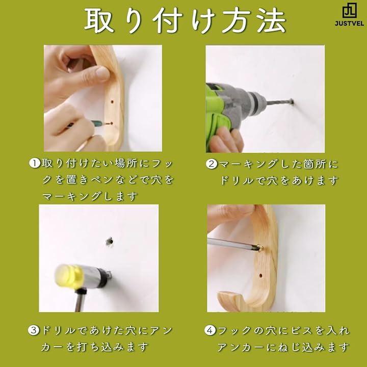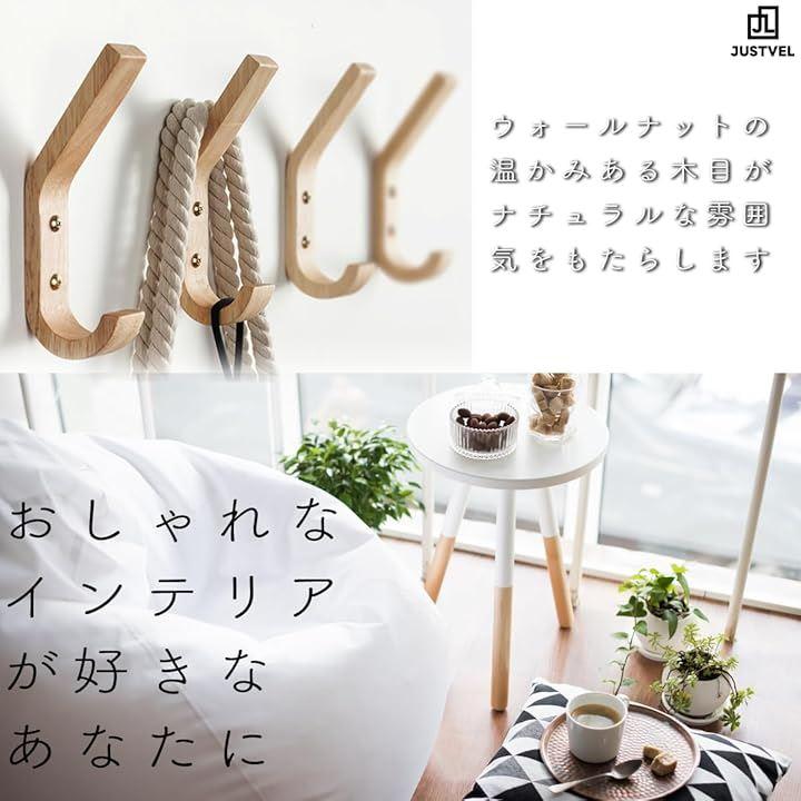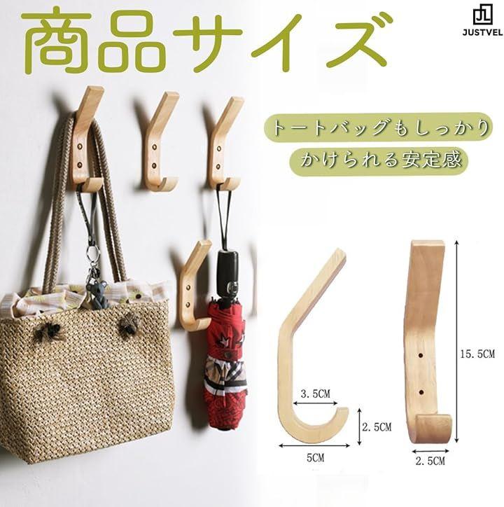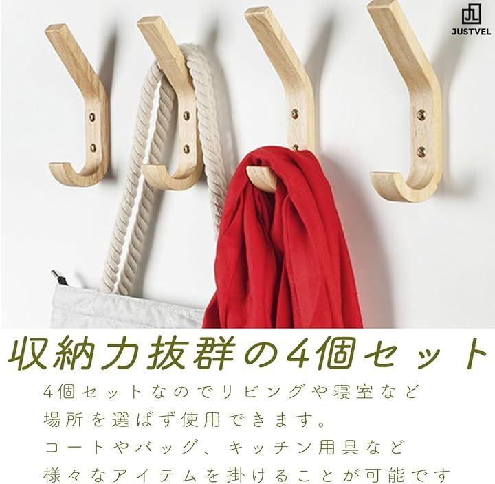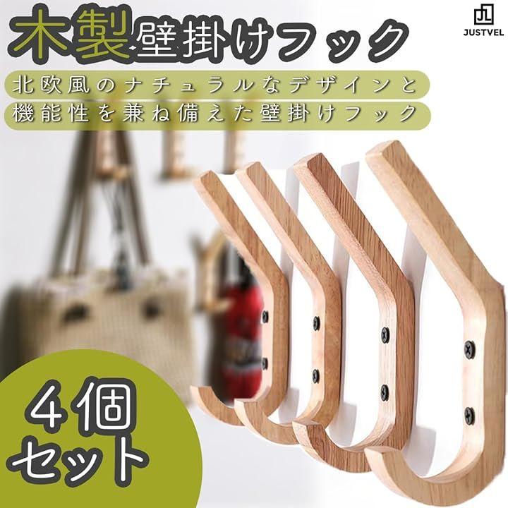 「木製壁掛けフック4個セット」スタイリッシュで北欧風のデザインが特徴の木製J字壁掛けフック4個セット。
