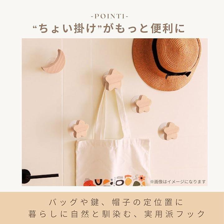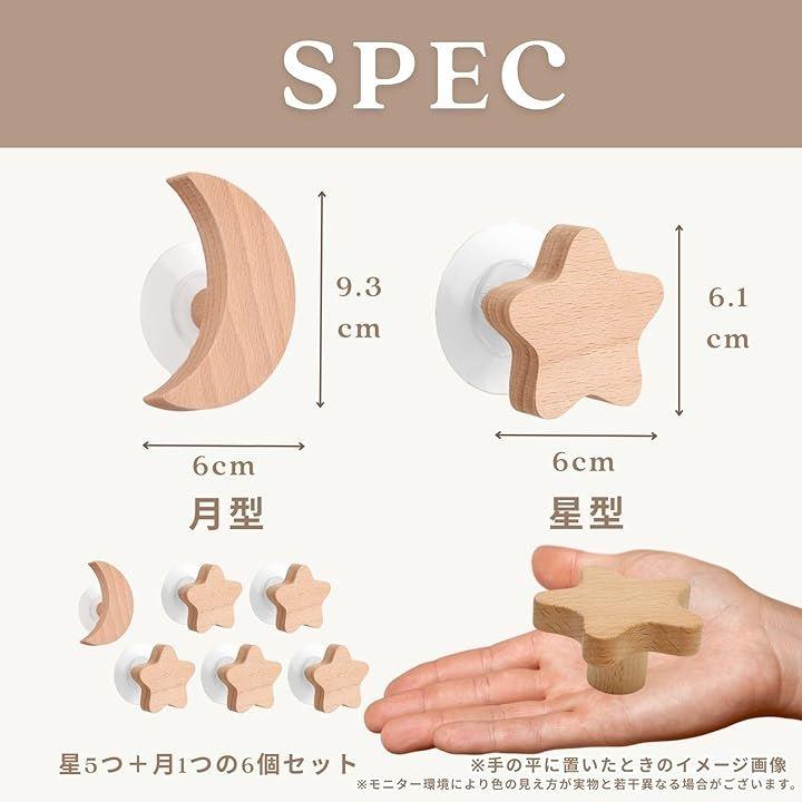 ・星型フック x5個(約6x6.1cm) ・月型フック x1個(約6x9.3cm) ・材質:木製 ・耐荷重:約30kg(ネジ留め時) *モニターにより色味が若干異なる場合がございます。