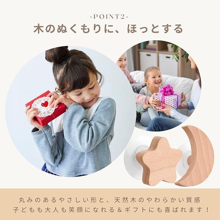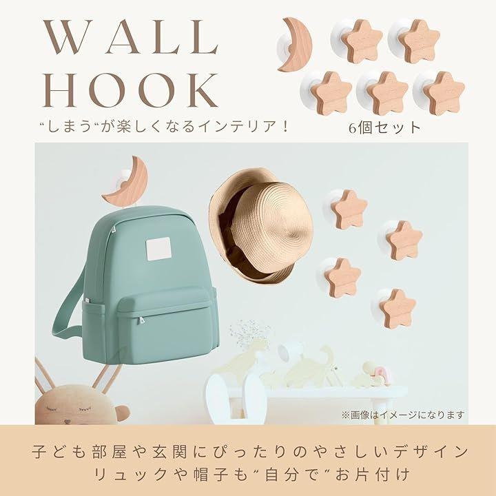 ナチュラルウッドのぬくもりと、星&月のやさしいデザインが魅力的な壁掛けフック6個セット。