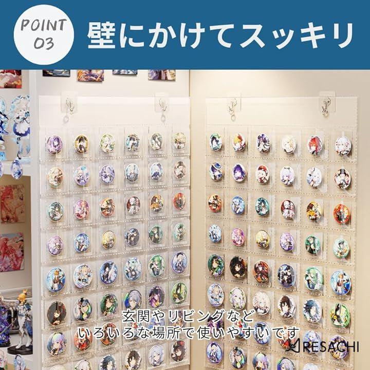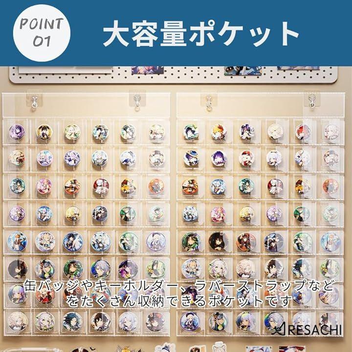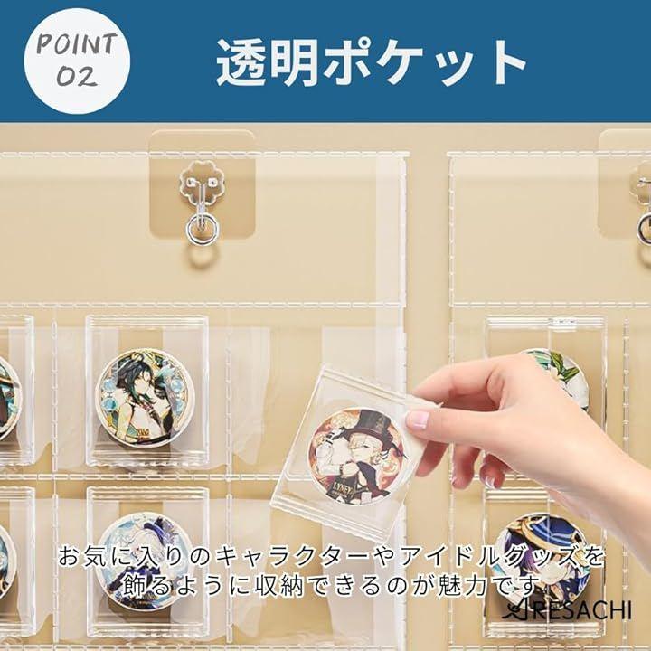 「透明ポケットで見せる収納」透明なポケットは、缶バッジのデザインをきれいに見せてくれます。