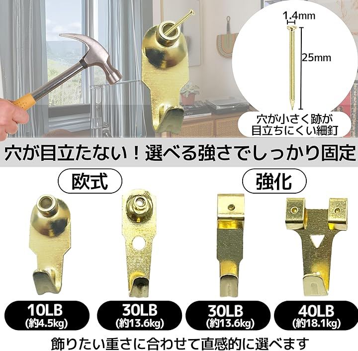 「選び方」仕上がり重視なら“欧式”/安定感重視なら“強化” 欧式10LB(約4.5kg):写真・A4、小物を壁をきれいに飾る 欧式30LB(約13.6kg):A3やや重め装飾をスマートに 強化30LB(約13.6kg):ズレにくい安定感で中量帯に 強化40LB(三角)(約18.1kg):厚手フレーム・重め時計をしっかり固定 “見た目を優先>欧式/安定優先>強化”で即決 重さに迷う時は上位LB、幅のある物は2個使いで仕上がりが整います