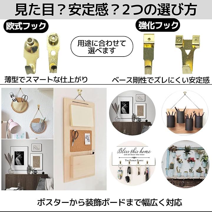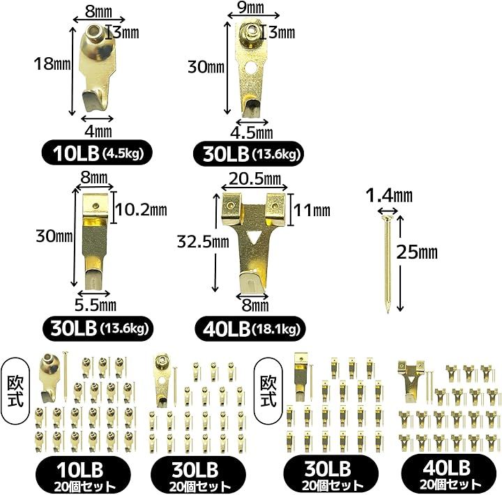 「選び方」仕上がり重視なら“欧式”/安定感重視なら“強化” 欧式10LB(約4.5kg):写真・A4、小物を壁をきれいに飾る 欧式30LB(約13.6kg):A3やや重め装飾をスマートに 強化30LB(約13.6kg):ズレにくい安定感で中量帯に 強化40LB(三角)(約18.1kg):厚手フレーム・重め時計をしっかり固定 “見た目を優先>欧式/安定優先>強化”で即決 重さに迷う時は上位LB、幅のある物は2個使いで仕上がりが整います