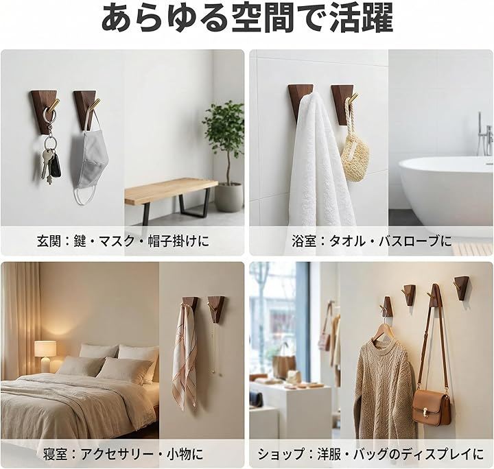 鍵・マスク・帽子・タオル・バッグなど日常使いから、民宿やホテルでの業務用まで幅広く活躍し、散らかりがちな小物をおしゃれに整理します。