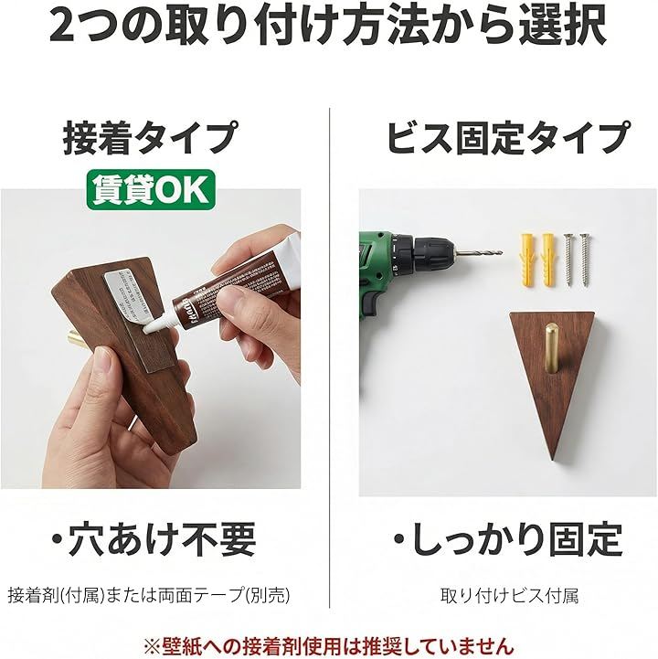 「賃貸住宅でも安心の2WAY取付」 穴あけ不要の強力接着タイプと、重量物対応のビス固定タイプから選択可能。