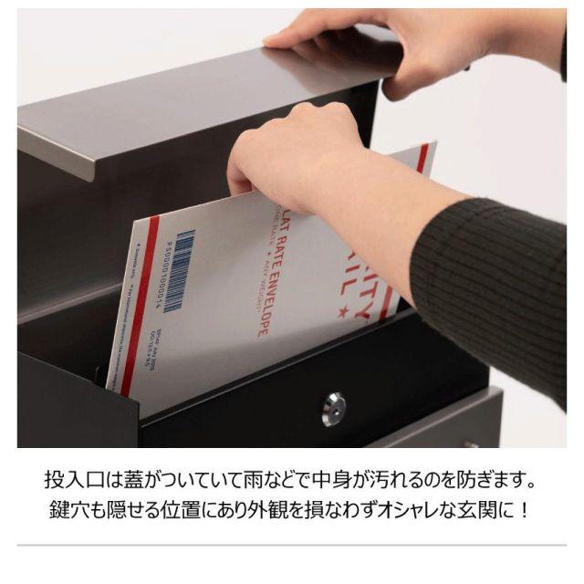 ●無駄をそぎ落としたシンプルデザインのメールボックス。●鍵穴も目立たないようにした構造となっておりスタイリッシュに仕上がっております。●本体のMAILBOXの文字は窓型(透かし)になっており、中の郵便物をわざわざ開けずに確認ができます。●カギ付きなので防犯面も安心。