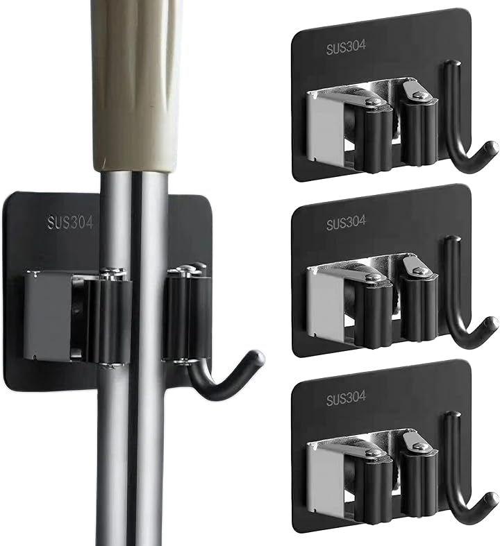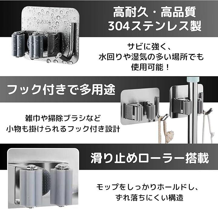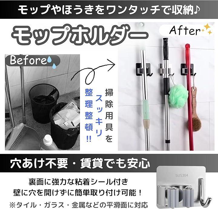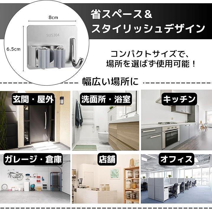 「こんな方におすすめ」 賃貸住宅でも壁を傷つけずに掃除用具を収納したい方 スタイリッシュで省スペースな掃除道具収納をお探しの方 モップ・ほうきだけでなく小物も一緒に掛けて整理したい方