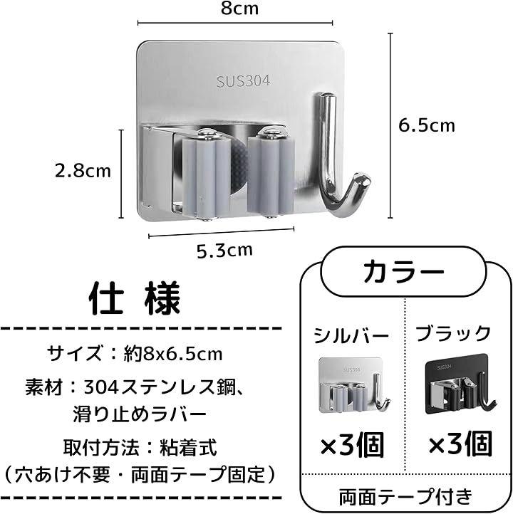 「仕様」数量:3個セット、取付方法:粘着式(穴あけ不要・両面テープ固定)、素材:304ステンレス鋼、滑り止めラバー、サイズ:約 W8xD5.3xH6.5cm、カラー:シルバー/ブラック