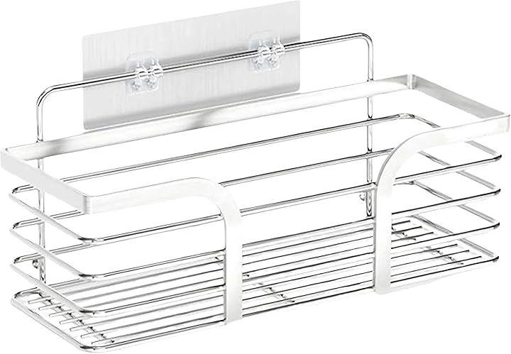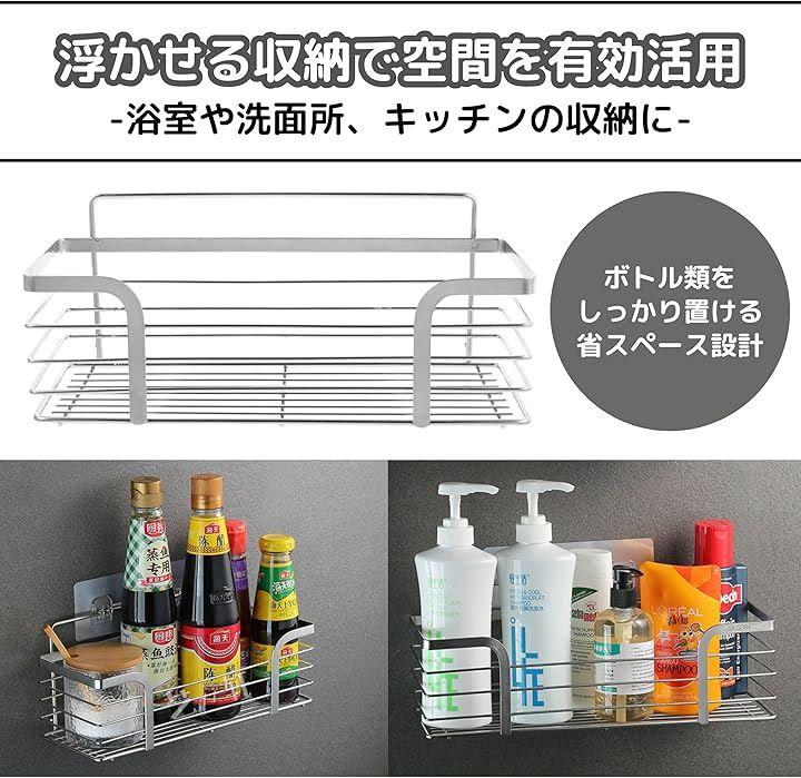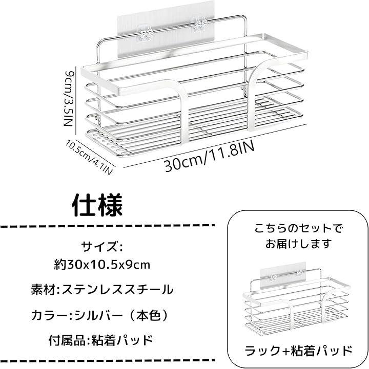 「仕様」 サイズ:約30x11x9cm 素材:ステンレススチール 設置方式:粘着パッド式(穴あけ不要) カラー:シルバー 用途:浴室・洗面所・キッチンなどの壁掛け収納に最適