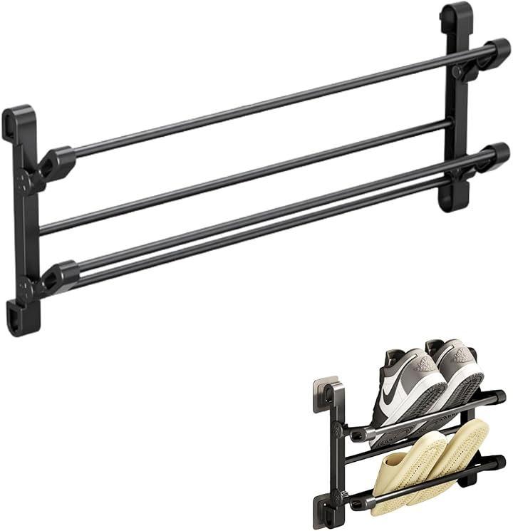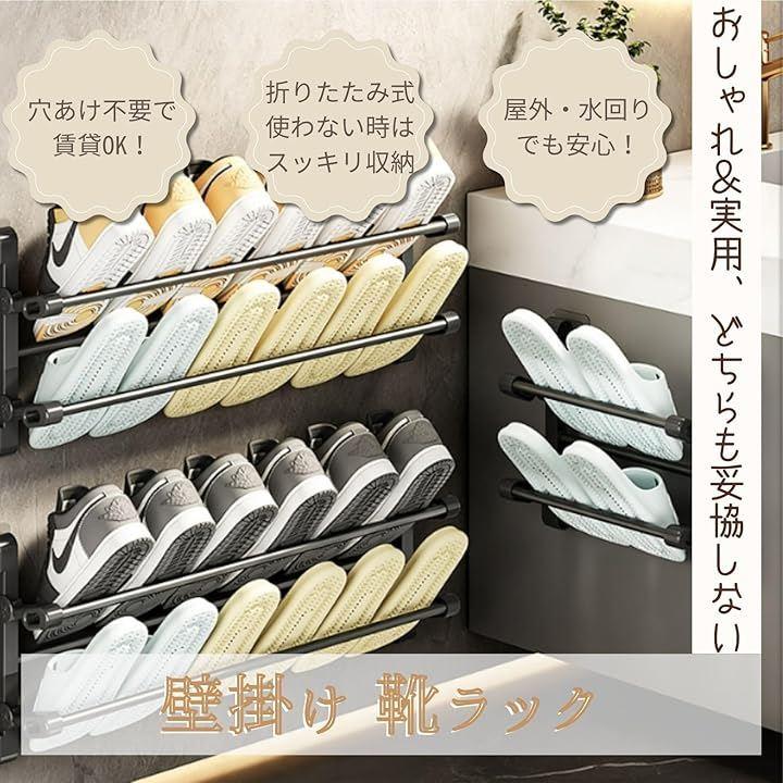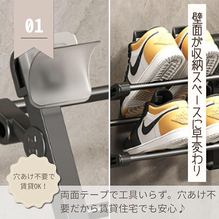 「穴あけ不要で賃貸OK。両面テープでしっかり固定できる壁掛け靴収納」ドア裏や壁面に両面テープで貼り付けるだけで設置完了。