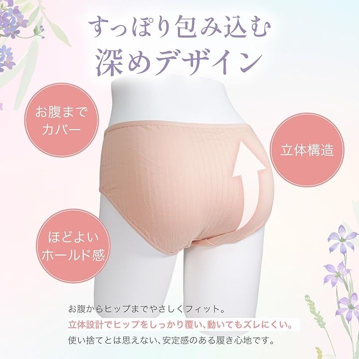 お腹とお尻をすっぽり包み込む深めデザインで、冷えが気になる方や、入院中のデリケートな時期にも安心。