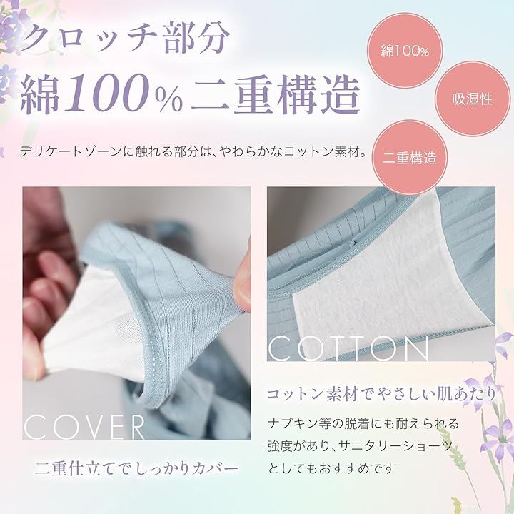 「デリケートな日も安心の、綿100%二重クロッチ」クロッチ(股部分)はお肌にやさしい綿100%の二重構造。