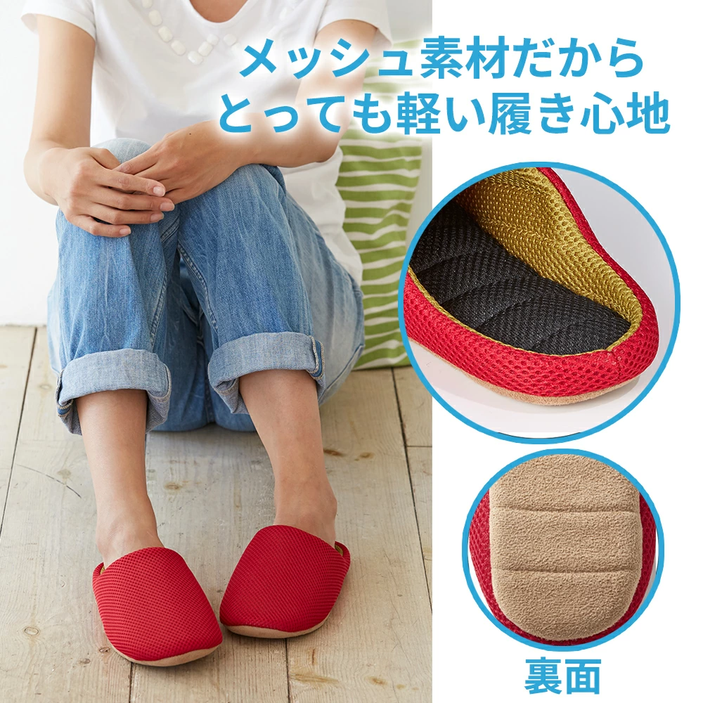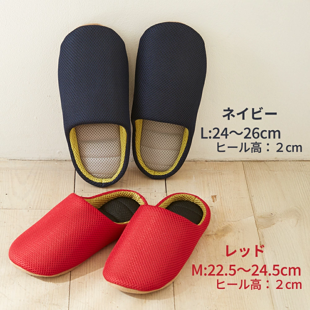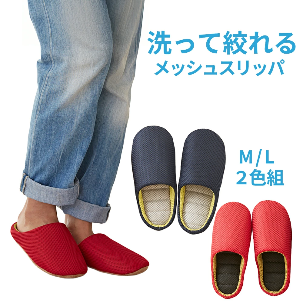 【商品名(JAN)】洗って絞れるメッシュスリッパ ML2色組 BCAA6005(4969354023256)【適応サイズ(約)】M:レッド/22.5~24.5cmL:ネイビー/24~26cm【重さ(片足)】M:40gL:47g【材質】甲:ポリエステル中板:ポリエステル底:ポリエステル【製造国】中国【商品情報】洗って絞れるスリッパです。絞れるのですぐ乾きます。気軽に洗えて清潔。とっても軽い履き心地。カラー:レッド/ネイビーの2色組。
