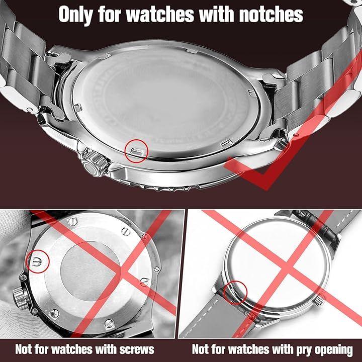 使用上の注意:このアジャスタブルウォッチバックオープナーは、ノッチのあるウォッチバックカバーにのみ適しており、こじ穴やネジのあるウォッチバックには適していません,ご購入前に、時計の裏蓋のタイプをご確認ください