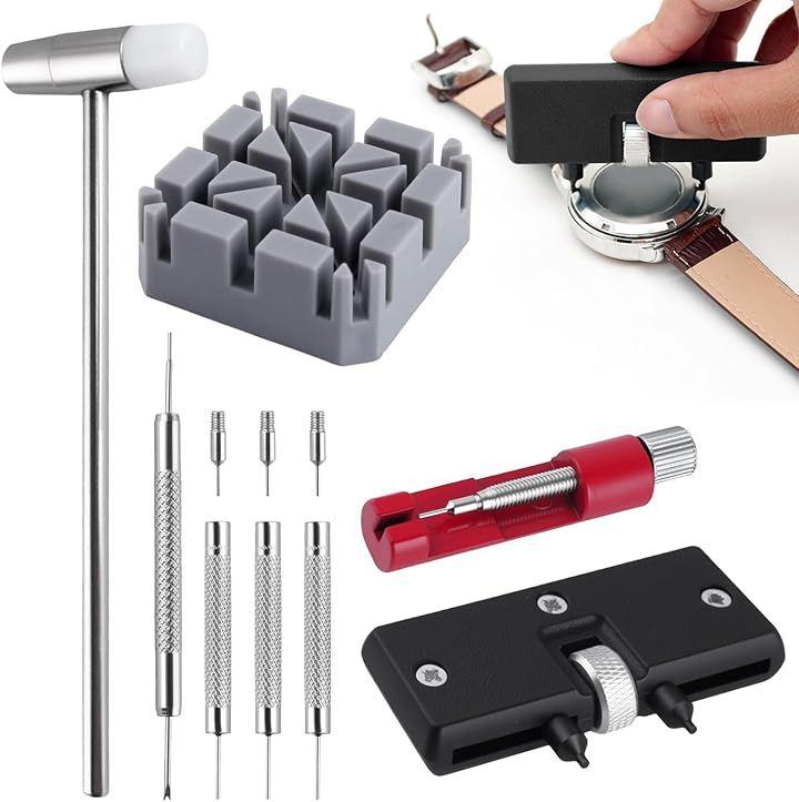 ウォッチアジャスターはストラップの取り外しに役立ち、ストラップの幅が広すぎる場合は、ストラップを固定するウォッチホルダーとストラップ調整ピン、ハンマーを併用してストラップを取り外すこともできます