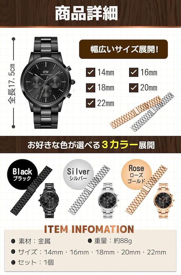 「商品特徴」(1)男女兼用のデザイン:シンプルなデザインで男女問わず使用可能/(2)幅広い対応サイズ:お使いの時計に合うサイズが見つかる/(3)高級感のある素材:光沢のある金属素材で高級感を演出。/(4)豊富なカラー展開:お洋服やお好みに合わせて選べる