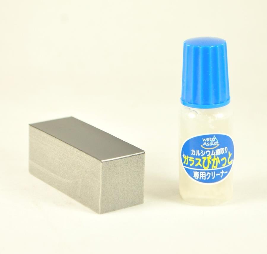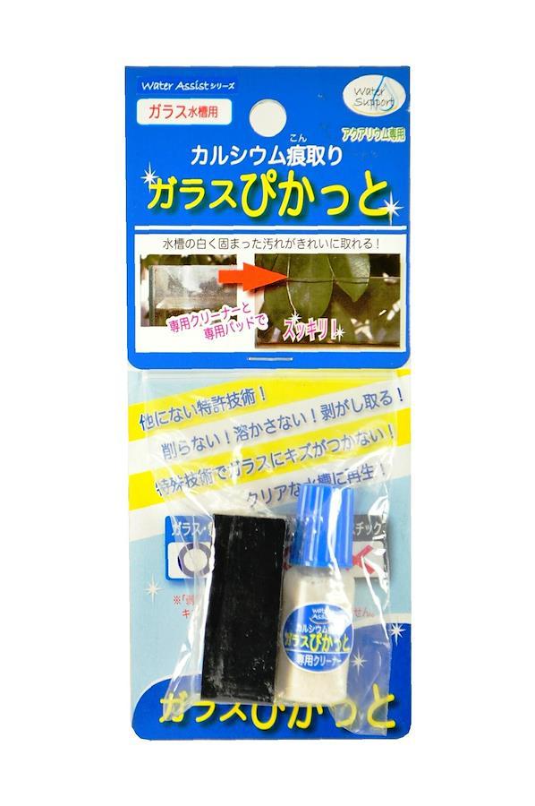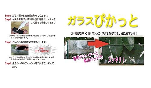『ガラスぴかっと』は今までどうしても取れなかった水槽表面やガラスフタにこびりついたカルシウム等の白い汚れを楽にきれいに取り去ります。また、ガラスより軟質の特殊材を使用しておりますので、ガラスにキズが付きません。●使い方は簡単! 付属のパッドにクリーナーを少量付けて白い汚れ部分をこするだけ。最後に柔らかい布かティッシュ等で拭き取ればぴかぴかなガラス面がよみがえります。●観賞魚水槽のほか、洗面台の鏡にも有効です。●セット内容:専用クリーナー(特殊砥粒材)、専用パッド(砥粒保持板) ※本品はガラス専用です。アクリル水槽、プラスチック水槽ではキズつく恐れがあるので使用しないでください。