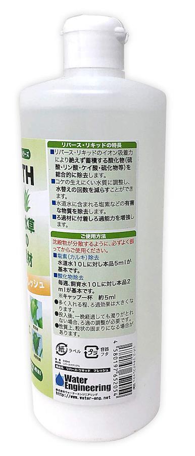 リバース・リキッドのイオン吸着力により絶えず蓄積する酸化物(硫酸、リン酸、ケイ酸、硫化物等)を総合的に除去する水質調整剤です。カルキ抜き効果もあります。コケの生えにくい水質に調整し、水換えの回数を減らすことができます。生体が取込む事により餌食いや排泄をサポートします。水道水に含まれる塩素などの有害な物質を除去します。ろ過材に付着しろ過能力を増強します。