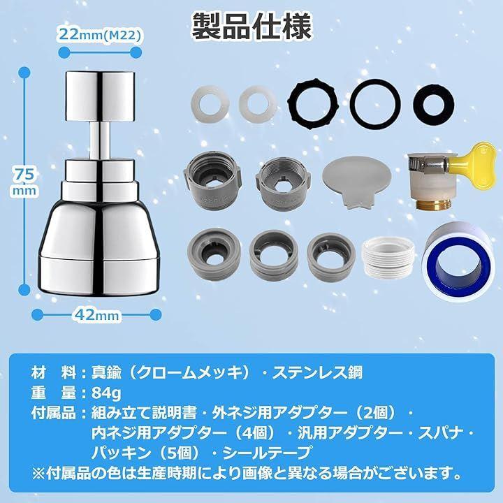 「製品仕様」高さ:75mm ヘッド幅:42mm 接続部:22mm(M22) 材料:真鍮(クロームメッキ)・ステンレス鋼 重量:84g 付属品:組み立て説明書・外ネジ用アダプター(2個)・内ネジ用アダプター(4個)・汎用アダプター・スパナ・パッキン(5個)・シールテープ *付属品の色は生産時期により画像と異なる場合がございます。