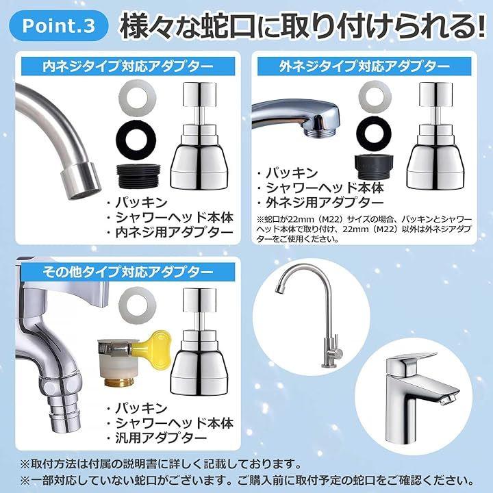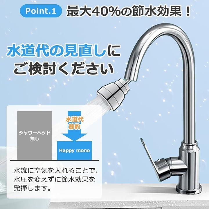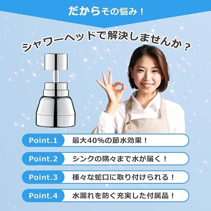 「だからその悩み。シャワーヘッドで解決しませんか?」Point.1:最大40%の節水効果。 Point.2:シンクの隅々まで水が届く。 Point.3:様々な蛇口に取り付けられる。 Point.4:水漏れを防ぐ充実した付属品。