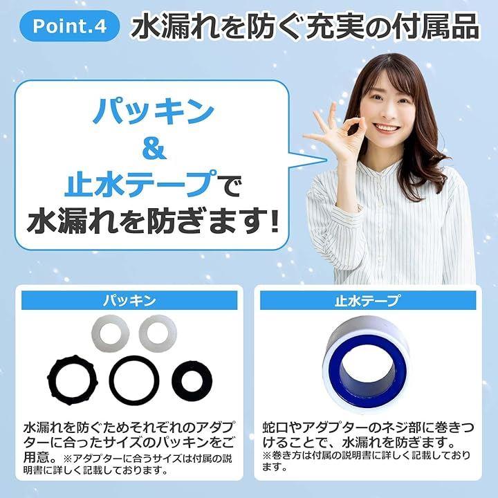 「Pinot4:水漏れを防ぐ充実の付属品」パッキン&止水テープで水漏れを防ぎます。 ・️パッキン 水漏れを防ぐためそれぞれのアダプターに合ったサイズのパッキンをご用意。