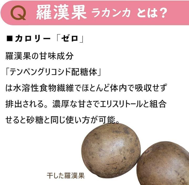 「神の実」羅漢果(らかんか ラカンカ)濃縮エキスに、天然「希少糖」エリスリトールを組み合わせ、プラス、低糖質ダイエットの強い味方「難消化性デキストリン(水溶性食物繊維)」を加えました。