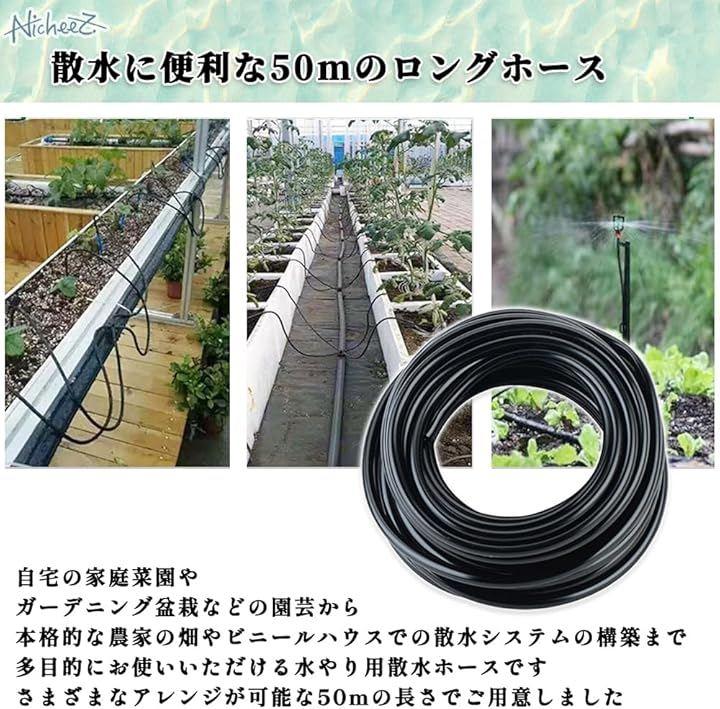 「散水に便利な50mのロングホース」自宅の家庭菜園やガーデニング・盆栽などの園芸から、本格的な農家の畑やビニールハウスでの散水システムの構築まで、多目的にお使いいただける水やり用散水ホースです。