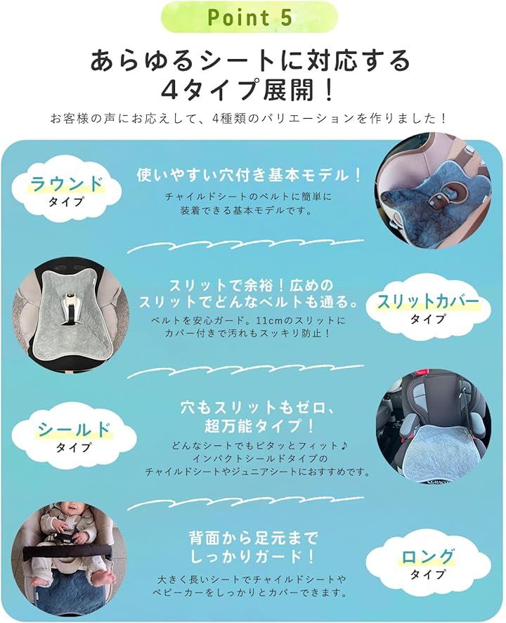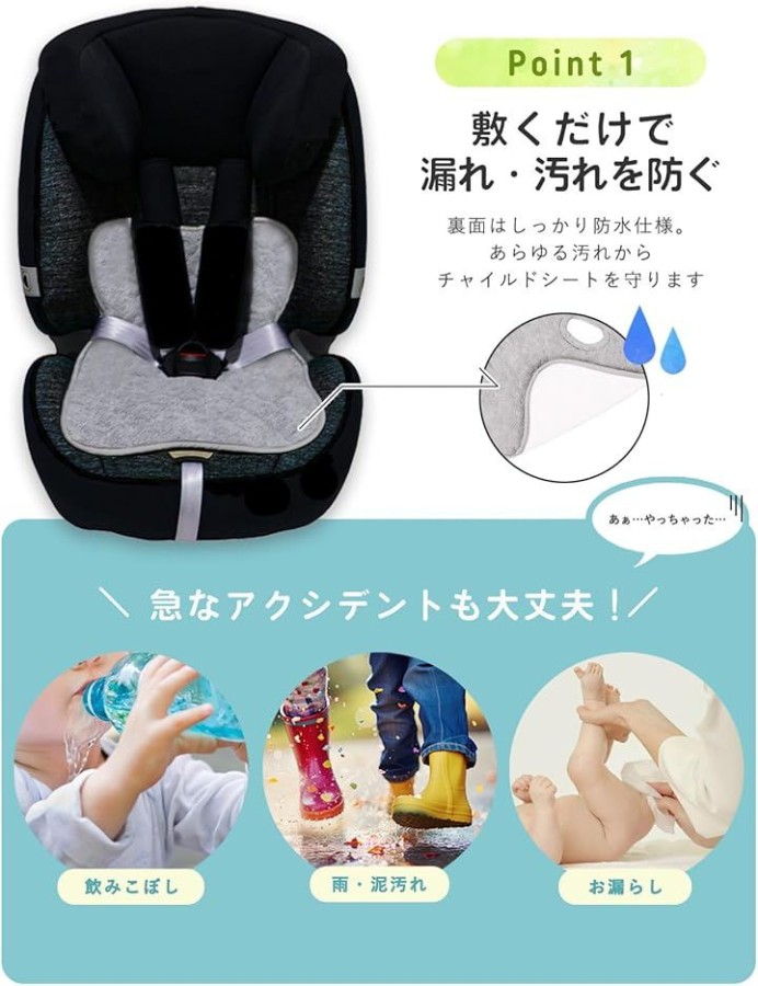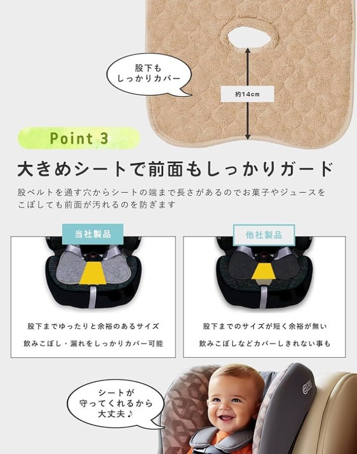「座面をしっかりガード」チャイルドシートはお手入れが難しいので、できれば失敗したくない・・そんな方に。オムツ漏れ、おしっこ、ジュース、泥汚れ等のあらゆる汚れから座面を守ります。