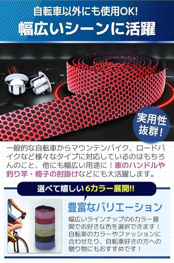 「商品特徴」(1)取り付け方法簡単.:裏面がシールなので工具不要で使用可能/(2)快適な握り心地:滑り止め効果により抜群のグリップ力/(3)汎用性抜群のテープ:自転車・釣り竿・椅子の肘掛けなど多用途/(4)嬉しい付属品付き:エンドキャップとエンドテープ付き。