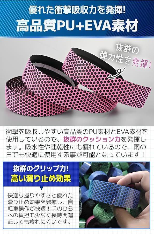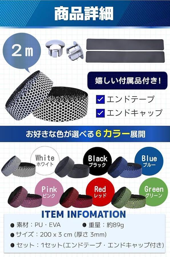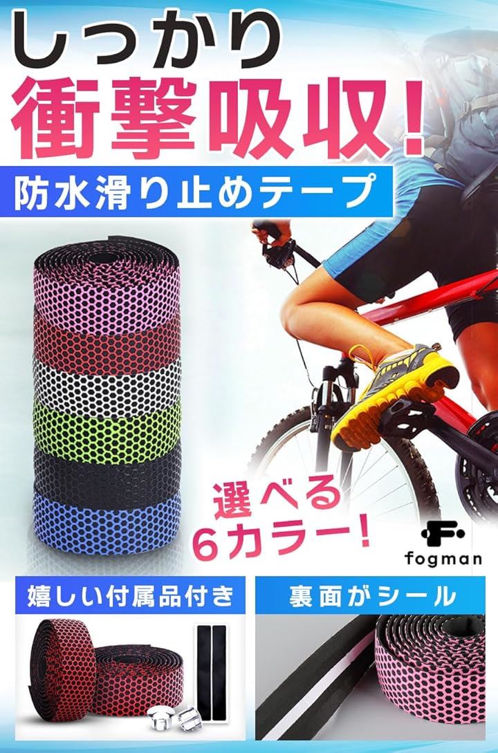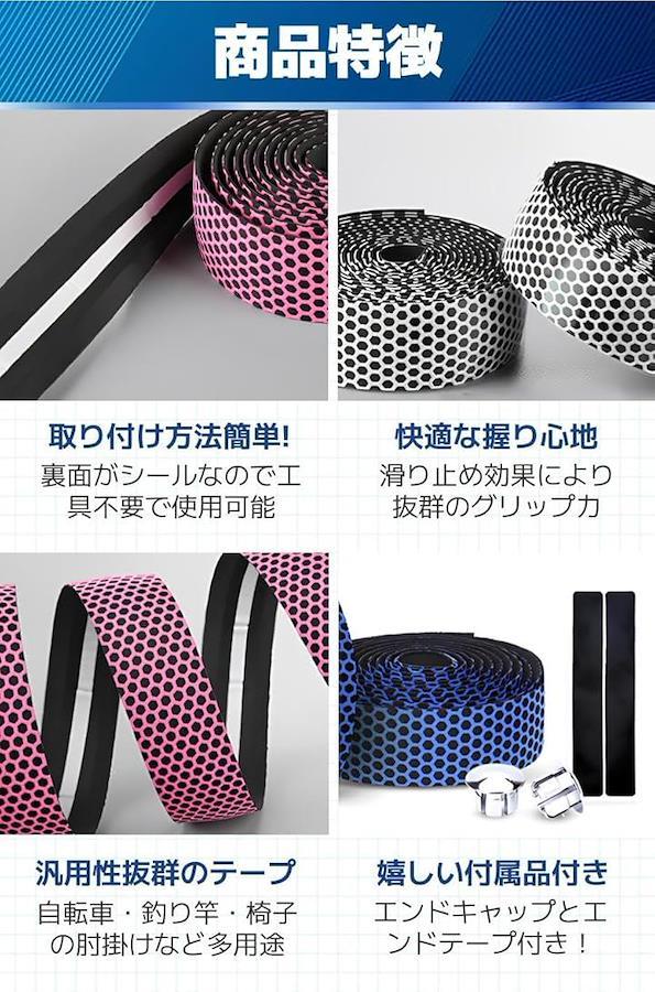 「商品特徴」(1)取り付け方法簡単.:裏面がシールなので工具不要で使用可能/(2)快適な握り心地:滑り止め効果により抜群のグリップ力/(3)汎用性抜群のテープ:自転車・釣り竿・椅子の肘掛けなど多用途/(4)嬉しい付属品付き:エンドキャップとエンドテープ付き。