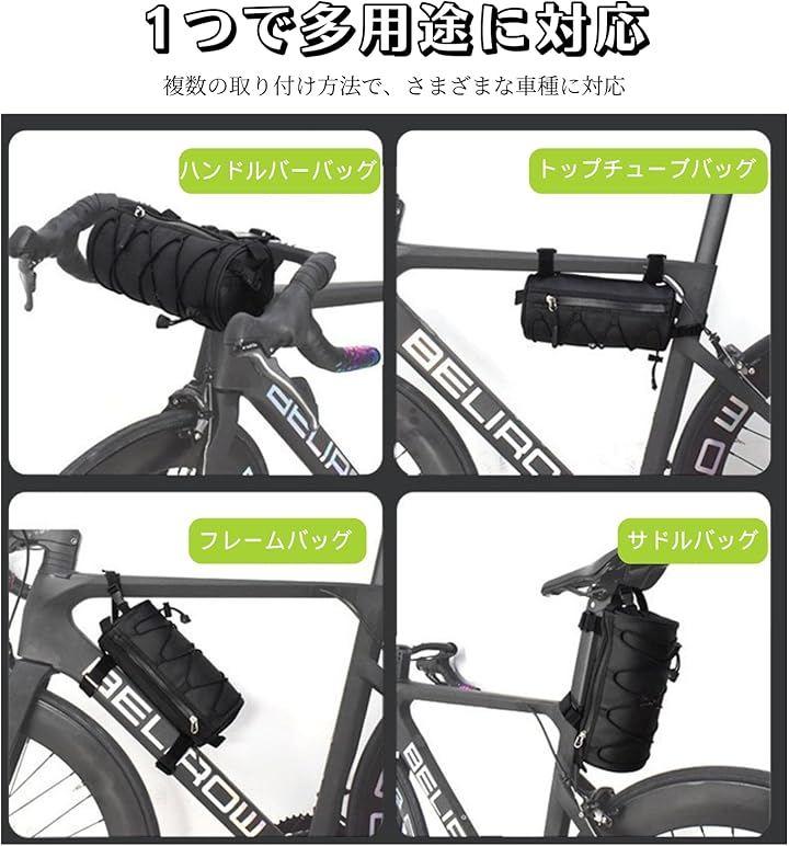 「多用途バッグ」面ファスナー式の装着方法で、フロントバッグとフレームバッグ二つの使い方があります。