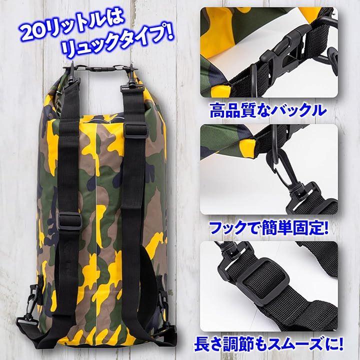 10Lと20Lの2サイズ展開で用途に合わせて選べるほか、アウトドアスタイルに映える迷彩カラー5色のラインナップしています。