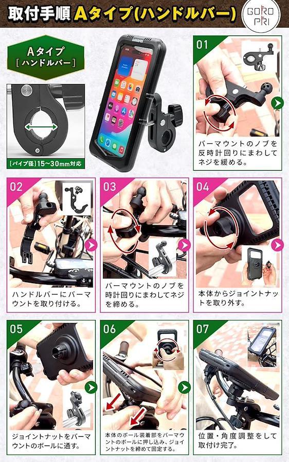 「取付方法」Aタイプは自転車やバイクのハンドルバーやクランプバー(パイプ径:15~30mm対応)、クランプ方式なので着脱が簡単なため、複数台で共有することもできます。