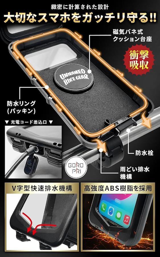走行中もあなたの大切なスマホをガッチリ守ることをお約束します!!特筆すべきは高い防水性能(IPX6)、豪雨の影響も全く受けることはありません。
