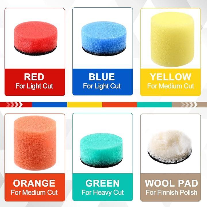 このキットには、すべてのニーズに応えるための異なる柔らかさのポリッシングパッドが6枚含まれています:軽いカッティング用の赤と青のフォームパッド、中程度のカッティング用の黄色とオレンジ、重いカッティング用の緑。