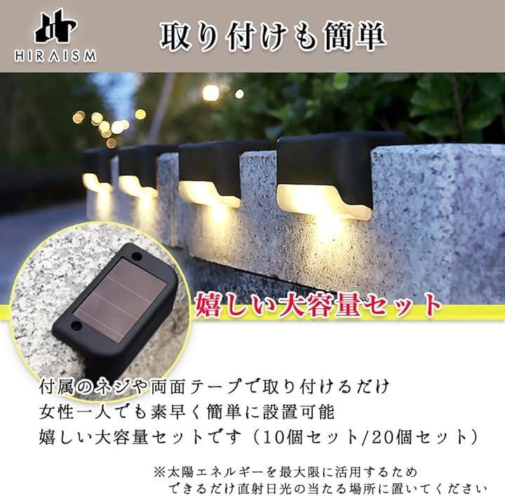 「取り付けも簡単。嬉しい10個セット」ソーラー発電による自動LED点灯ですので、配線やバッテリーを購入する必要はなく、付属のネジや両面テープで取り付けるだけですぐにご使用いただけます。