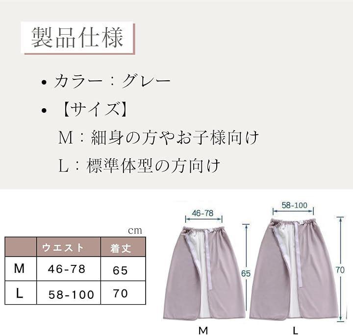 「製品仕様」*カラー:グレー *「サイズ展開」M:ウエストは46~78cm 長さ65cm L:ウエストは58~100cm 長さ70cm