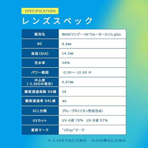 コンタクトレンズは高度管理医療機器です。必ずご購入前に眼科医の検査・処方を受けてからお求めください。 ご使用の前に必ず添付文書をよく読み、眼科医の指示を守り正しくご使用ください。 医療機器承認番号:22400BZX00211A02 WAVEワンデー ウォータースリム plusは、酸素透過性が高いので目の健康にもやさしいレンズです。 潤い成分であるMPCポリマー配合のため、従来品の2倍以上の保水力のあるうるおい成分で、1日中快適なつけごこちを実現。 UV吸収剤を配合しているため、紫外線からも瞳をしっかりと守ります。 素材:HEMA DIA:14.2mm 含水率:58%(高含水)。水分が多いためレンズが柔らかく、異物感を感じにくい特長があります。 BC:8.8 UVカット:UV-A波78%/UV-B波97%