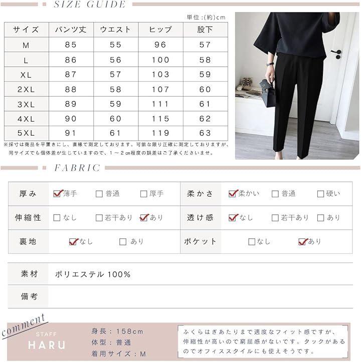 「Size」パンツ丈/ウエスト/ヒップ/股下 「M」 85/55/96/57 「L」 86/56/100/58 「XL」 87/57/103/59 「2XL」 88/58/107/60 「3XL」 89/59/111/61「4XL」 90/60/115/62「5XL」 91/61/119/63 *採寸は平置きにし、直線で測定しております。