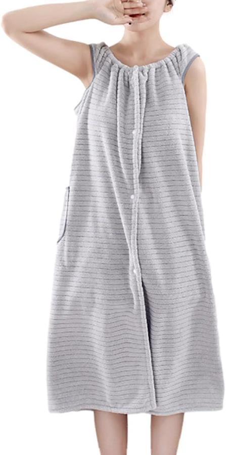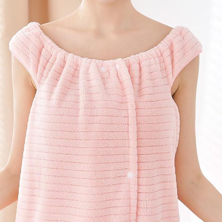 「体にやさしくフィット」タオルのずれ落ちの心配なく幅広い体型をしっかりカバー・邪魔にならない長さと軽さ・前開きでネックライン、お風呂上りのスキンケアタイムや上半身のお手入れに便利